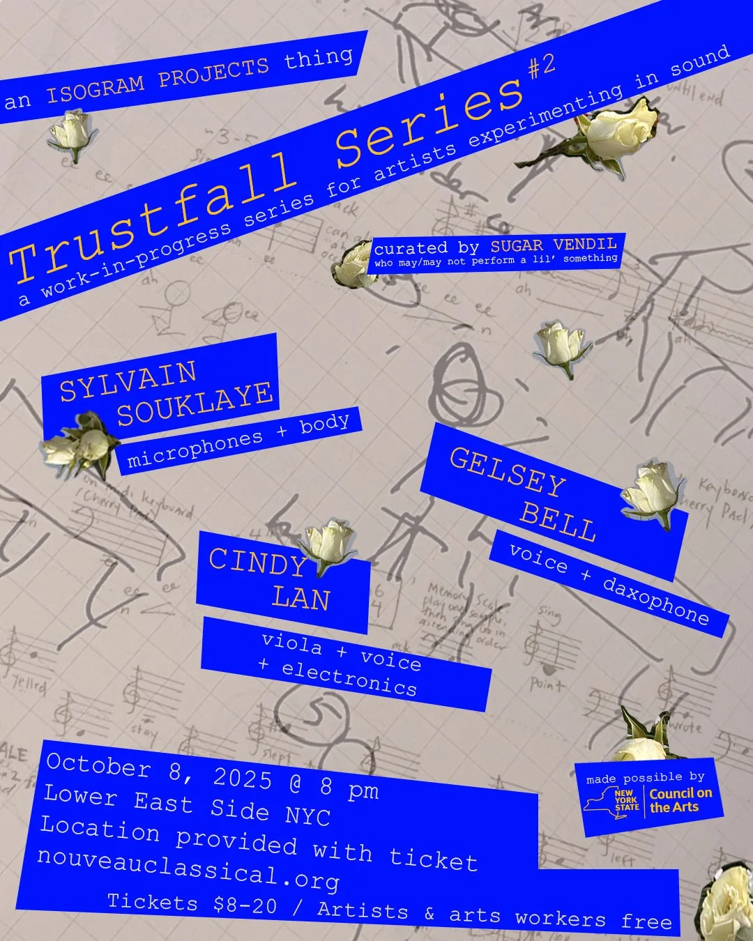 Join us for our second (!) installment of Trustfall Series. This one features Gelsey Bell (voice + daxophone), Cindy Lan(viola, voice + electronics) & Sylvain Souklaye (microphones and body). The show will close with a short improv by Gelsey, Cindy, Sylvain, and Sugar!